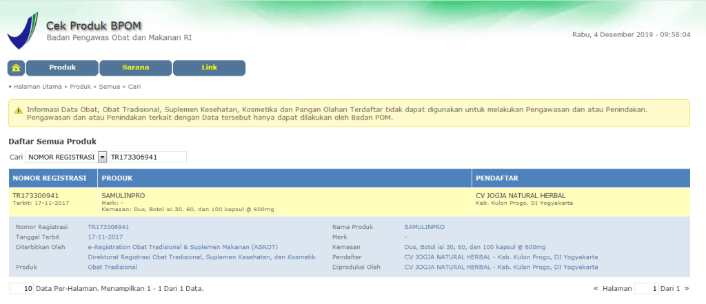 Produk herbal SAMULINPRO SEHAT SENDI merupakan produk herbal yang PALING AMAN dan HALAL untuk dikonsumsi karena produk herbal ini sudah memiliki IZIN RESMI dari BPOM RI dan LEGALITAS HALAL MUI, Nomor BPOMNYA sudah tercantum dalam kemasan.
