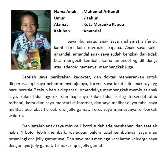 Untuk Memperkuat Bukti Bahwa Produk Herbal ini Benar-Benar AMPUH MENGATASI PENYAKIT ADENOIDITIS, BERIKUT INI AKAN KAMI CANTUMKAN BEBERAPA TESTIMONI NYATA KONSUMEN KAMI YANG TELAH MENGKONSUMSI PRODUK HERBAL QNC JELLY GAMAT