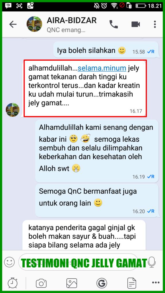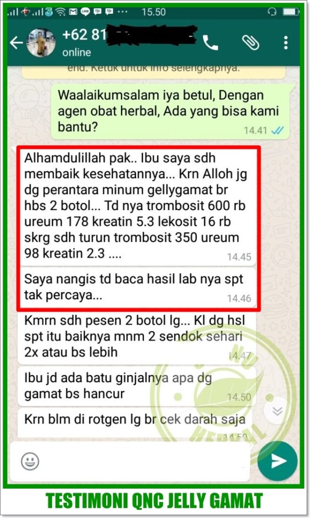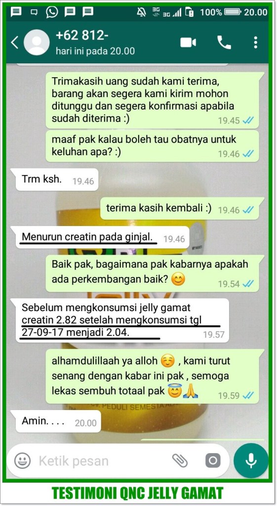 Qnc Jelly Gamat merupakan obat herbal multikhasiat yang dapat mengatasi berbagai macam gangguan kesehatan dan penyakit, termasuk mampu menurunkan kadar kreatinin secara alami. Terbuat dari ekstrak teripang emas murni yang di olah dengan menggunakan teknologi khusus yaitu “Natural Extraching”, sehingga khasiat dan kandungannya lebih terjaga.