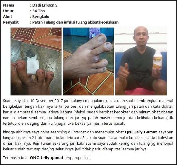 Untuk Memperkuat Bukti Bahwa Produk Herbal ini Benar-Benar AMPUH MENGATASI PENYAKIT INFEKSI TULANG, BERIKUT INI AKAN KAMI CANTUMKAN BEBERAPA TESTIMONI NYATA KONSUMEN KAMI YANG TELAH MENGKONSUMSI PRODUK HERBAL QNC JELLY GAMAT