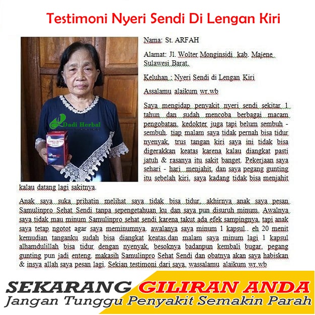 Alhamdulillah, Terimakasih Ibu. St,ARFAH atas testimoninya yang sembuh dari penyakit Nyeri Sendi Di Lengan Kiri setelah secara rutin melakukan pengobatan dengan Samulinpro Sehat Sendi.