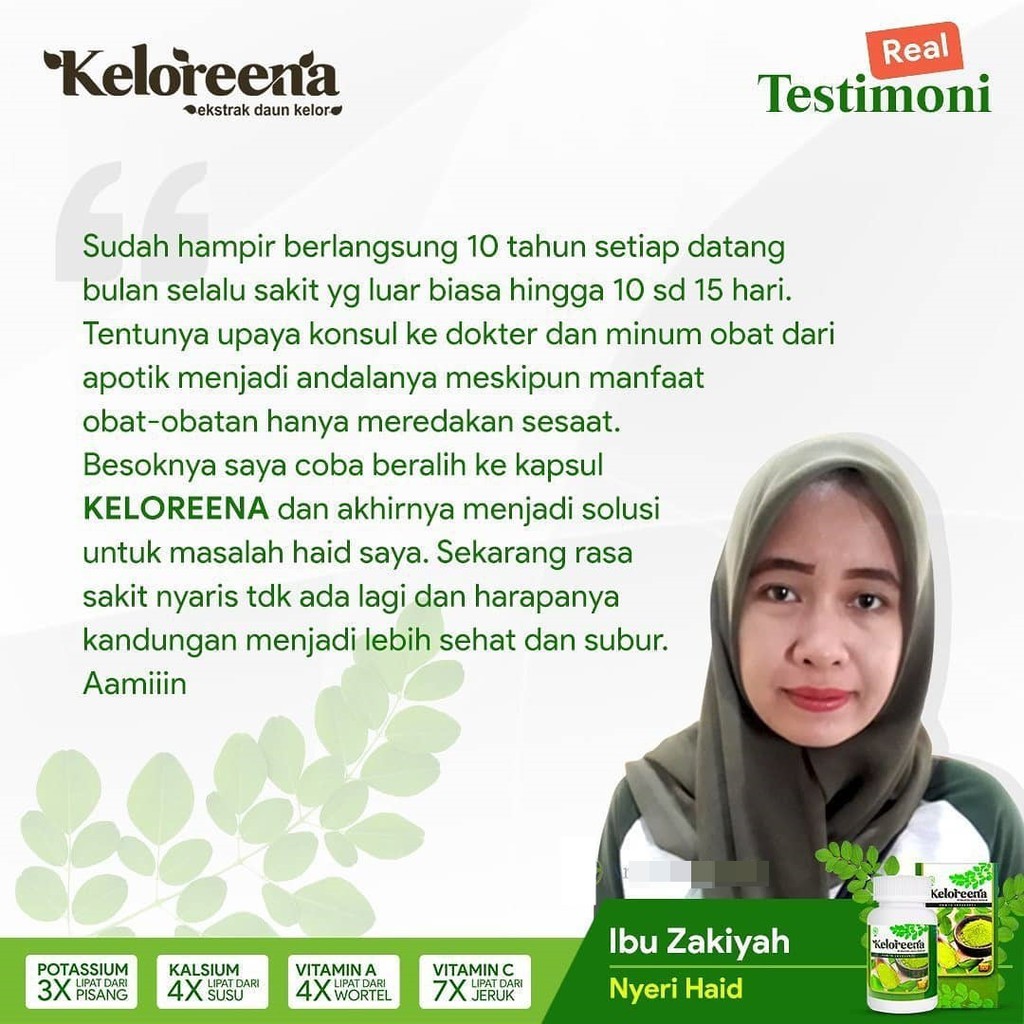 Pada kesempatan kali ini, kami akan share pengalaman dari konsumen kami yang berhasil sembuh alami dari keluhan nyeri haid, setelah rutin konsumsi herbal keloreena kapsul. Keloreena merupakan suplemen kesehatan alami berbentuk kapsul, yang berkomposisikan 100% serbuk dan ekstrak tanaman daun kelor (moringga oleifera) murni.