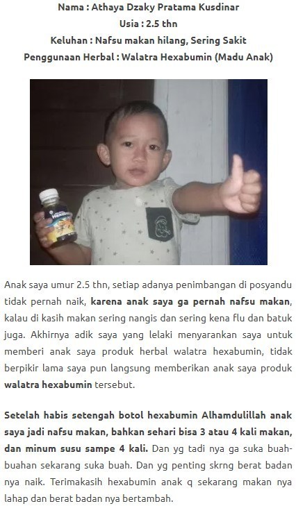 Walatra Hexabumin adalah produk kesehatan terbaru yang diproduksi oleh CV Jogja Natural Herbal. Diformulasikan khusus untuk mengatasi kesehatan anak – anak. Diolah menggunakan metode Nano Technologi yang mampu menyerap dan menghasilkan produk berkualitas unggulan karena menggunakan pemprosesan yang baik dan tepat berbeda dari yang lainnya.